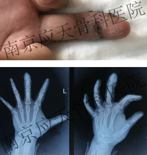 患者江苏南京居民,于2013年因左手中指痛风石就诊于我院行手术治疗,术后康复出院,后于2017年左手中指末节再次出现痛风石并感肿痛,就诊当地医院,行手术治疗,术后康复出院,患者左手中指末节再次肿痛并有渗出物排出,患者为求进一步诊治来我院就诊。
