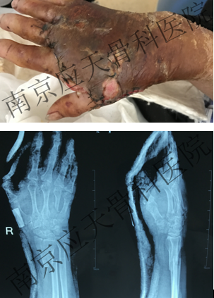 患者安徽池州居民,于2019年11月份不慎挤压致右手疼痛肿胀伴有出血,就诊当地医院,行"清创缝合"处理,术后予以抗感染补液等对症处理,术后切口肿胀伴淡黄色液体渗出,患者为求进一步诊治来我院就诊。